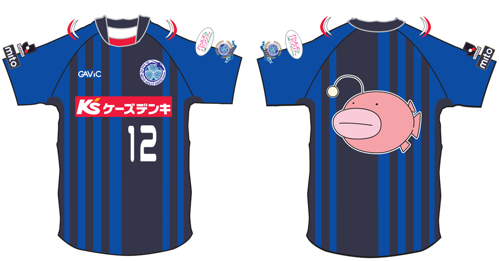 1月に発表された 水戸の2014ホームモデルをベースに、ガルパンの主人公チームである「あんこうチーム」の象徴、あんこうが背中にプリントされたユニフォーム。