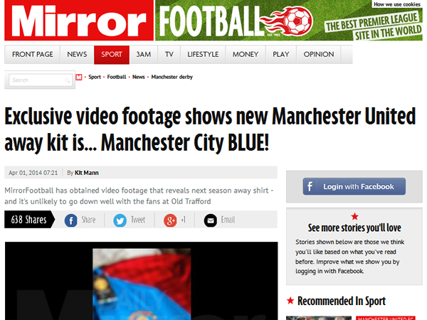 『Mirror』が「マンチェスター・ユナイテッドの新しいアウェイユニフォームは、シティの青!」という衝撃のリーク。
