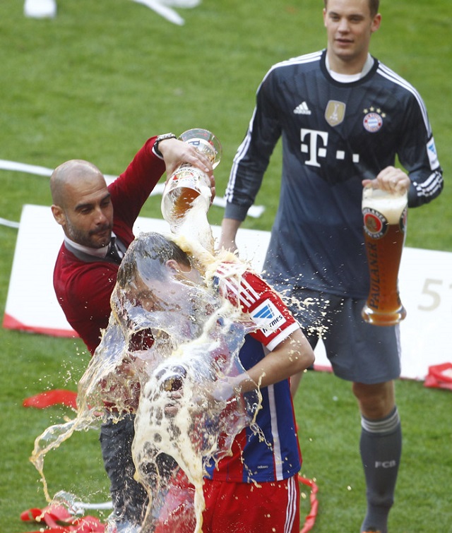 試合終了後のピッチでは恒例のビールシャワー。今年はジョゼップ・グアルディオラ監督がターゲット!