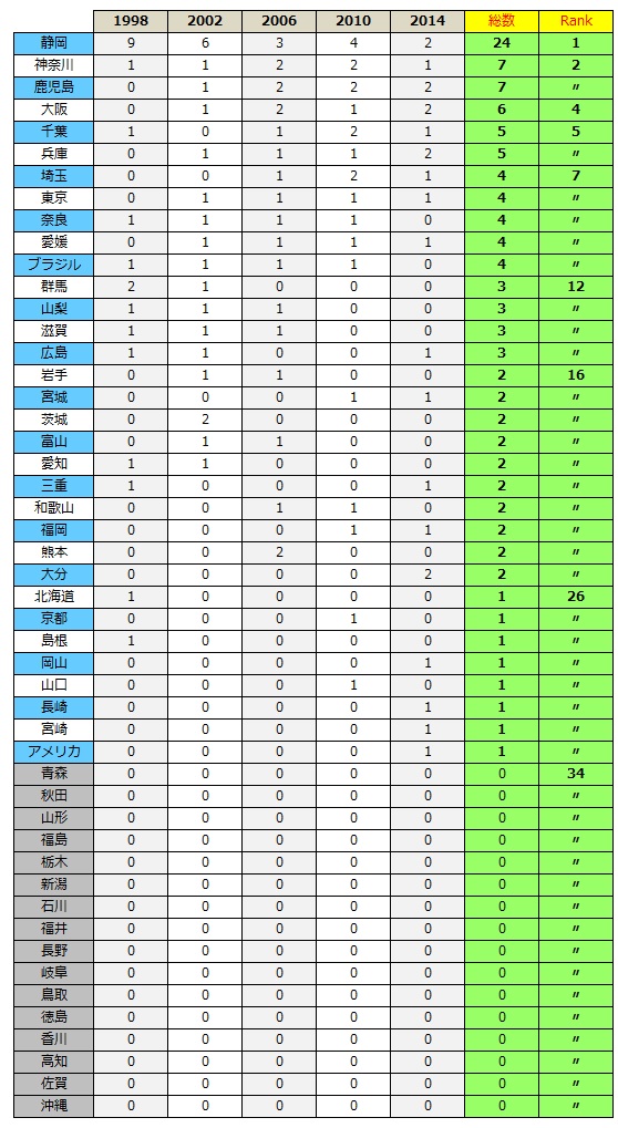サッカー王国、静岡がダントツの数字を残している。ただ、1998年大会では9人という大所帯だったが、その後はその割合が下がる傾向をみせている。 また、16の県からはまだW杯戦士が輩出されていない。