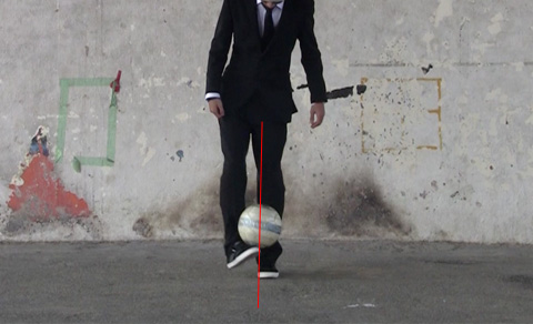 跨ぎながらジャンプし、足をクロスさせた状態でボールを上に蹴り上げます。