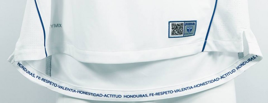 裾部分の内側には、 “Honduras, Fe-Respeto-Valentía-Honestidad-Actitud”(ホンジュラス、信頼、敬意、勇気、誠実、態度)というチームの精神を表したメッセージ。