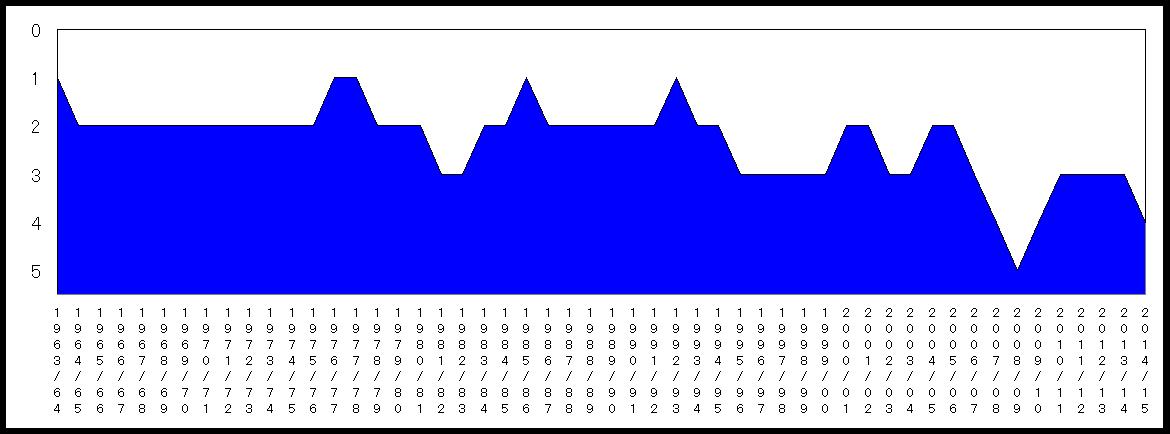 1963年、西ドイツでブンデスリーガが組織されると、1.FCザールブリュッケンは16チームの1部創設メンバーに入りました。ただ、南西地域リーグで選ばれたのは前年優勝の1.FCカイザースラウテルンと5位のこのクラブだけ。地域性に加え、2位のボルシア・ノインキルヒェンに優先された過去の実績が重視された選考の結果は最下位。新設されたレギオナルリーガへの降格でした(代わりにボルシア・ノインキルヒェンが昇格)。その後のクラブの在籍リーグのグレード(部)は、<図1>の通り。