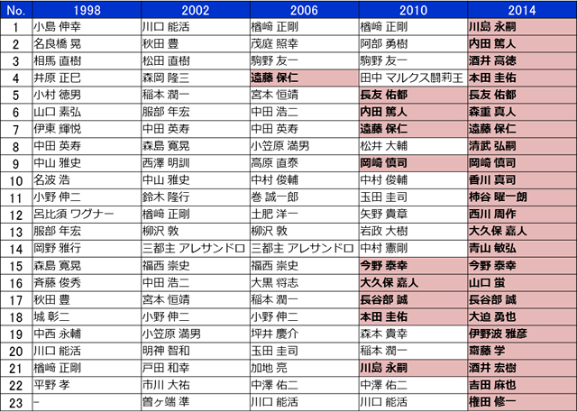 初出場となった1998年からワールドカップ5大会での背番号変遷は以下の通り。前回大会に出場した選手9人のうち、上述した長谷部、遠藤、岡崎のほか長友佑都、今野泰幸の5人が2大会連続で同じ背番号となり、変更されたのは川島永嗣(21→1)、内田篤人(6→2)、本田圭佑(18→4)、大久保嘉人(16→13)の4人となっている。