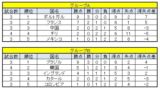 2試合両方共に引き分けたため、順位に変更はなかったが、2位の韓国は試合数がひとつ多いためイングランドのほうが有利といえる。