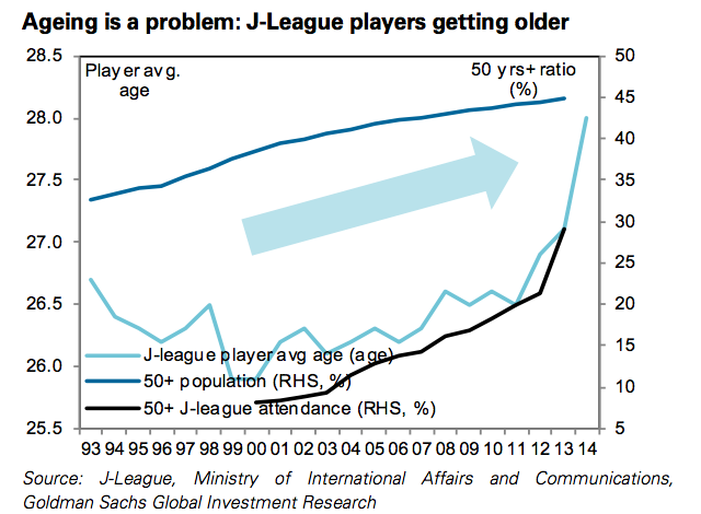 なお、この報告書の日本代表を分析する項では、日本社会の高齢化についても触れられており、Jリーグの選手年齢およびJリーグにおける観客の高齢化も指摘されている。