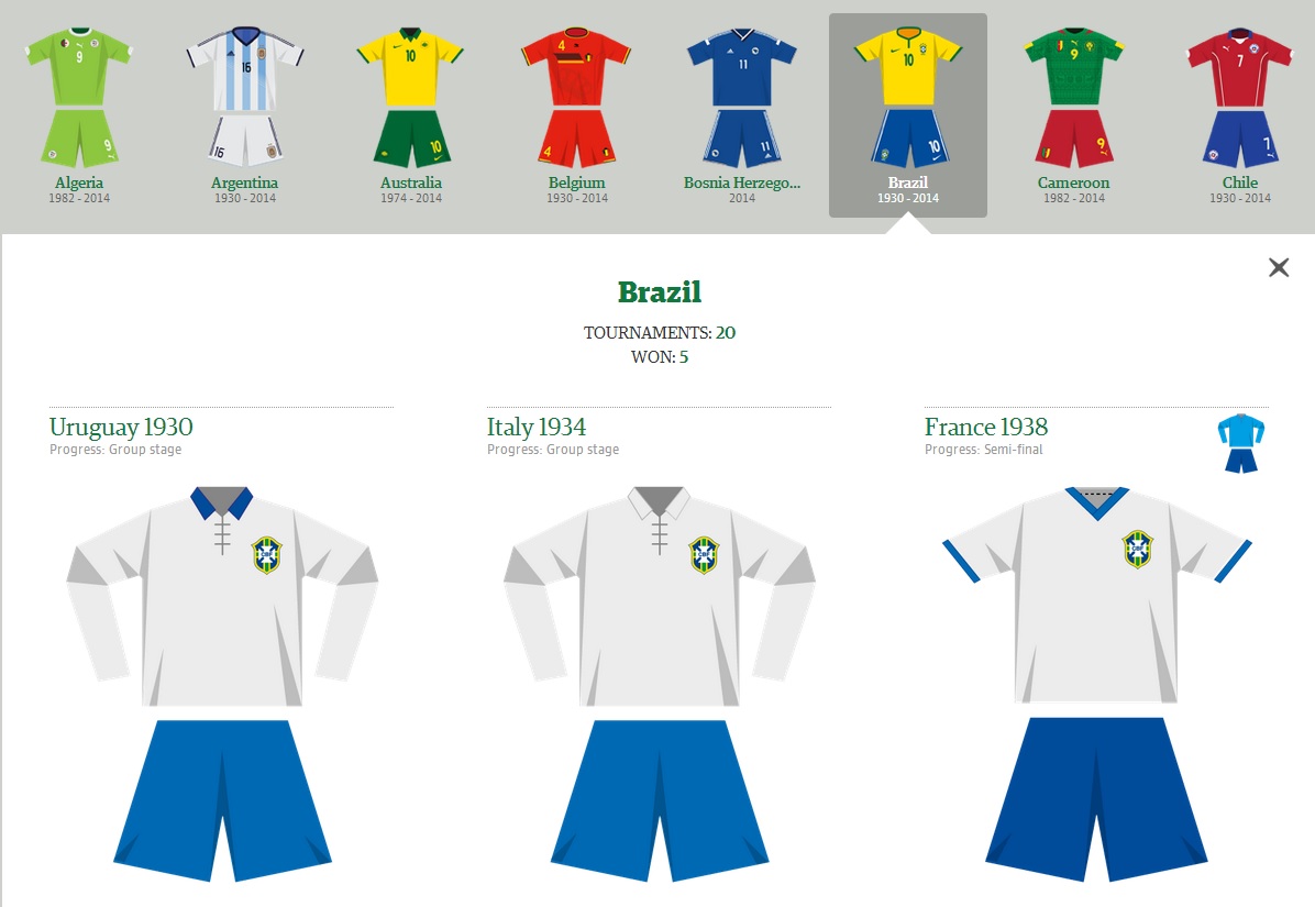 今年のブラジル・ワールドカップに出場する32か国がこれまでに出場した大会で着用したユニフォームを見ることが出来る『guardian』のサイトがちょっと素敵だったので紹介。