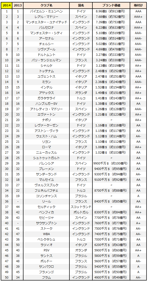 最高評価を受けたのは2013年に続き、ドイツのバイエルン・ミュンヘン。その価値は8億9600万ドル(約913億円)と、昨年よりもさらに3600万ドル価値を上げている。