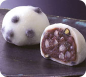 「岡埜栄泉」の看板商品、あんこがギッシリ詰まった豆大福は、白黒のサッカーボールにも似ている? 1個220円。