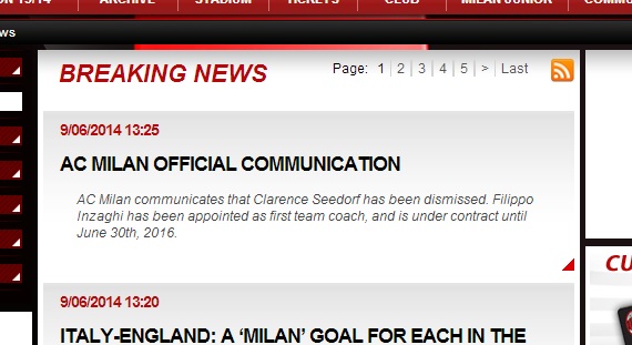 6月9日、イタリア・セリエAのミランは「クラレンス・セードルフ監督を解任した」と公式サイトで発表した。
