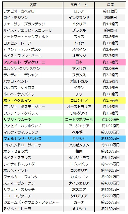 ブラジル・ワールドカップに出場する全32か国の監督の年俸をランキングにしたものがこちら。