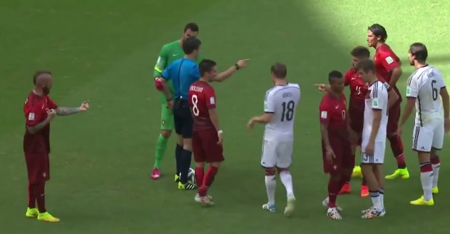 前半立ち上がりにPKで失点したポルトガルは、前半37分にDFペペが一発退場。その直後に撮影された、ポルトガル代表MFラウール・メイレレスのあるポーズが物議を醸した。