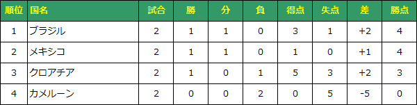 カメルーン対ブラジルでブラジルが敗れた場合のみ、勝ち点で並び得失点差を争う