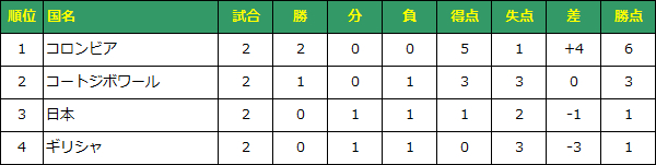 日本対コロンビアで引き分けか日本が敗れると突破。日本が勝利した場合、日本と得失点差を争う