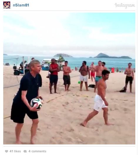 解説者としてブラジルに滞在しているアーセナルのアーセン・ヴェンゲル監督が、浜辺で若者たちとビーチサッカーを楽しんだらしい。