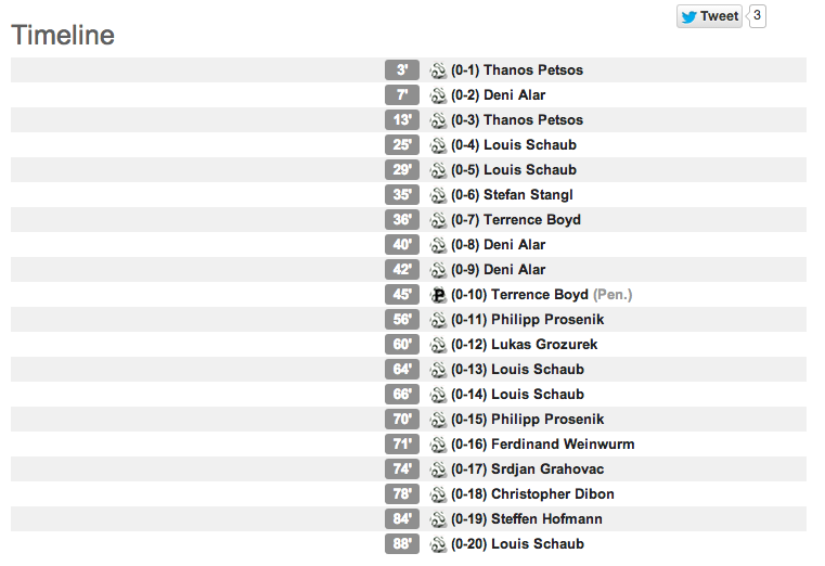こちらは、オーストリアのザンクト・パンターレオン=エルラとラピド・ウィーンの親善試合の結果である。現地時間6月29日に行われたこの試合では、なんとラピド・ウィーンが20-0の爆勝を収めたというのだ。