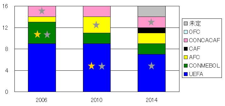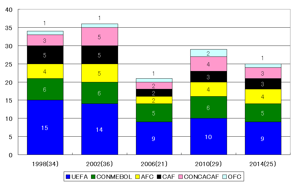 一方、たとえいろいろな対立があっても、FIFAはやはり、最後にUEFAを頼ります。それは1月のコラムでも出した1998-2014年の大陸別主審数と、2006年以降の3大会での決勝トーナメントでの試合割り当てを見ればすぐに分かります。
