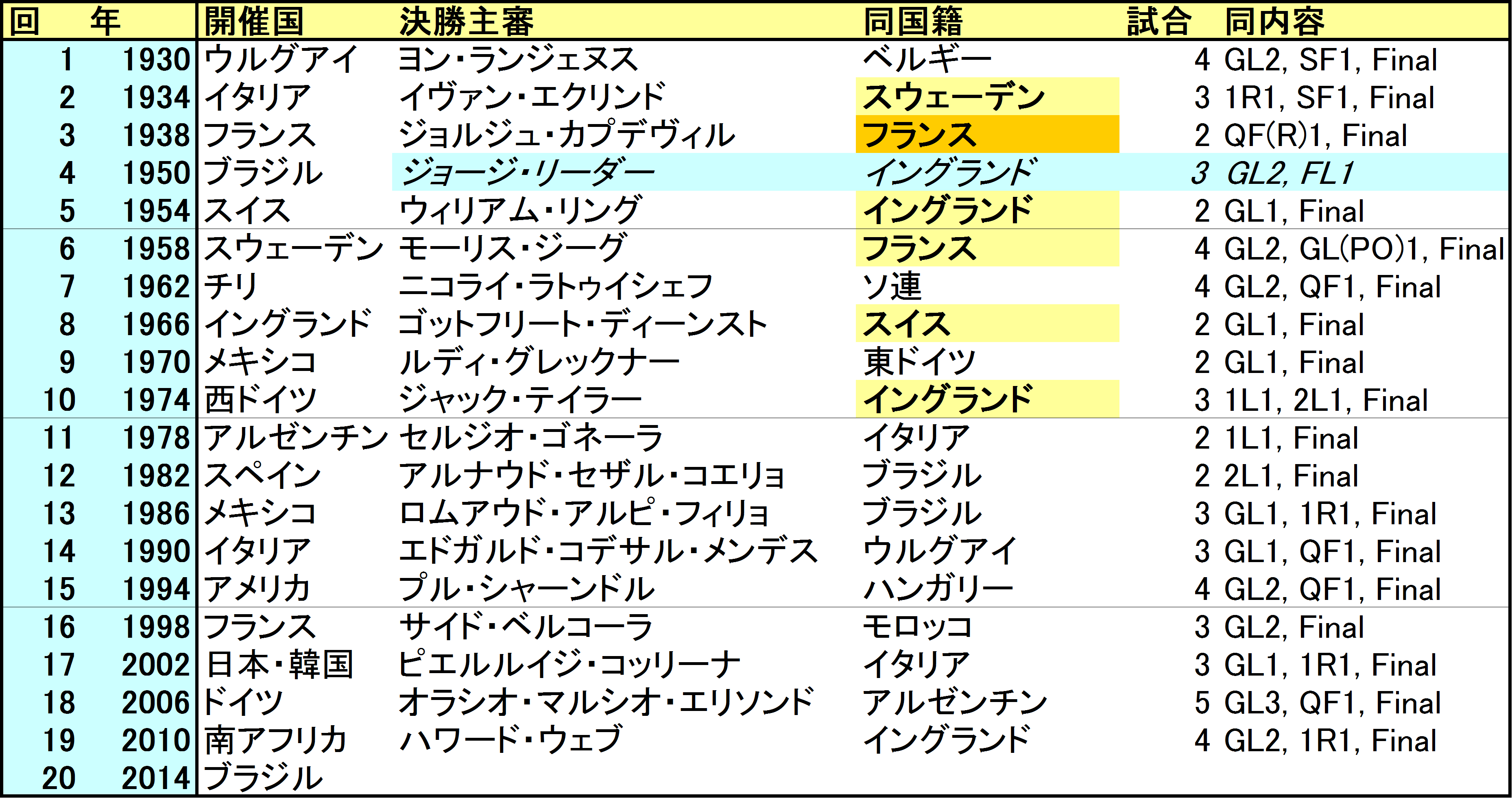 第二次大戦での中断を挟んで、第11回の1978年アルゼンチン大会まで、4度の南米と1度のメキシコ(北中米)開催も含めて全て欧州諸国の審判が担当していました。その後は南米(CONMEBOL)から3回連続で選ばれ、1994年のアメリカ大会からはUEFAとそれ以外から交互に割り当てられてきました。なので、今回は普通に考えればUEFA以外から選ばれるはず。これもウェブを本命には推せない理由の一つです。