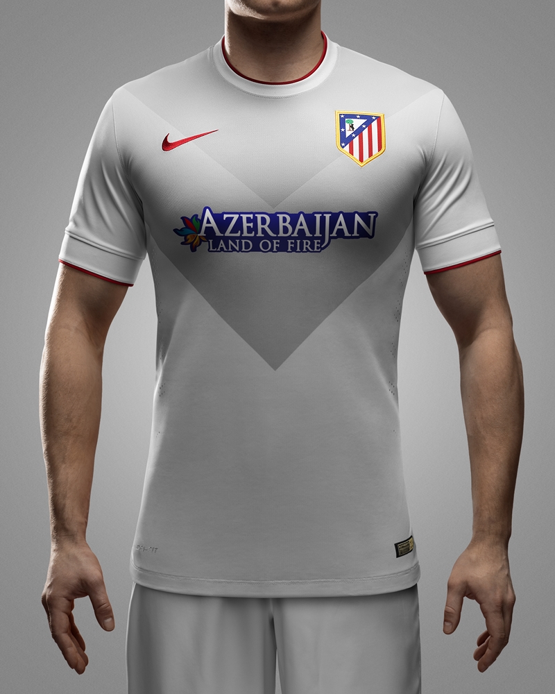 アトレティコのアウェイとしては珍しいグレーを基調に、Nikeの2014-15モデルで見慣れたシェブロン(V字)パターンのグラデーションを採用したデザイン。胸スポンサーは引き続きアゼルバイジャン政府が務める。