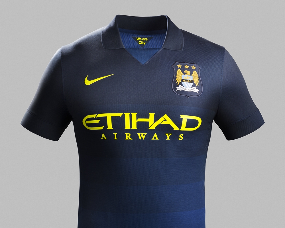 そのシティの2014-15アウェイが25日に発表され、紺をベースにしたユニフォームが登場。濃淡2色によるグラデーションを採用しており、首元の逆三角形型のガゼット部分には明るめの青が配されている。