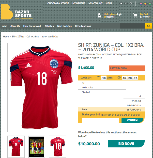 そんなスニガのシャツを競合にかけたのは、ブラジルのオークションサイト『BAZAR SPORT』。1週間前に500ドル(およそ5万1000円)でスタートしたこのオークションは現在1400ドル(およそ14万3000円)の入札が6件ついている(15日12時現在)。