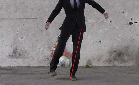軸足にボールを押し当てながら右足を真上に振り上げる事で、ボールをすぴんさせて上に放り上げます。