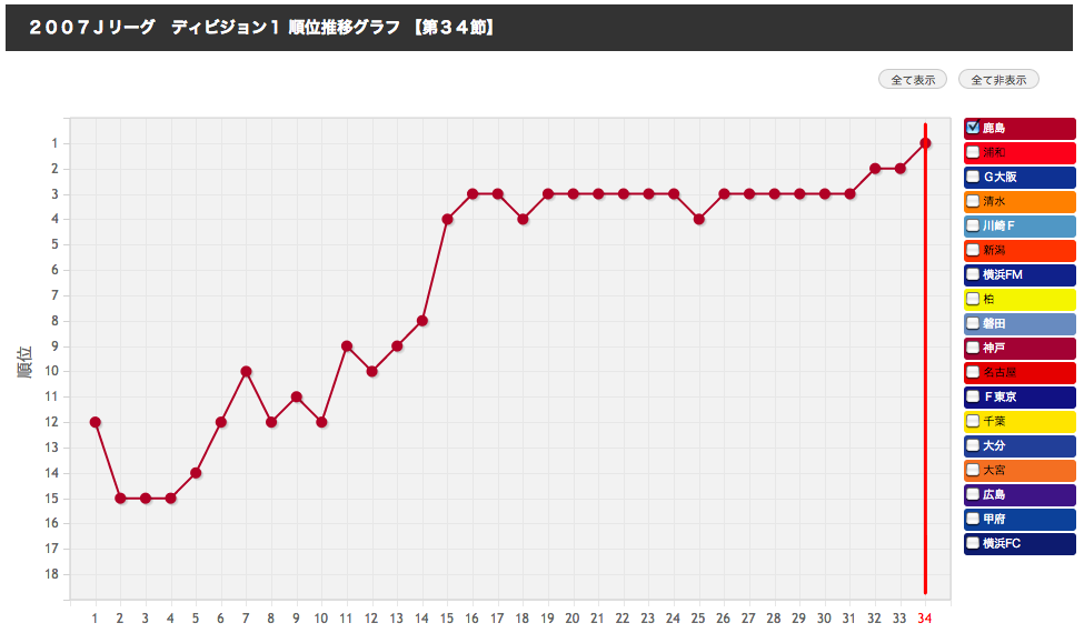 鹿島アントラーズドラマチックな展開で優勝を決めたこの2007年シーズンでさえ、推移表の軸はこうなっている。このシーズン、鹿島は第26節から最終節まで破竹の9連勝を収め、最終節で初めて首位に立つという奇跡の大逆転劇を飾った。