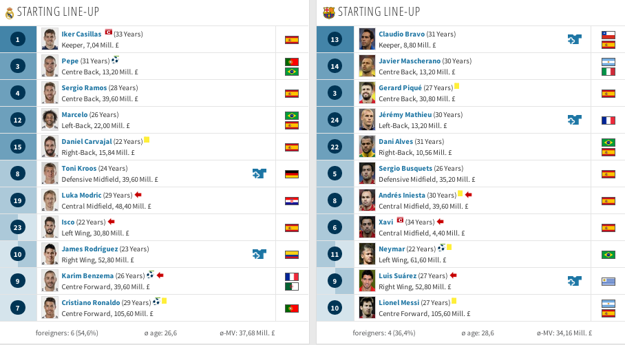 — Real Madrid C. F. (@realmadrid) 2014, 10月 26通算229度目となったクラシコをより注目度の高いものにしたのは、ルイス・スアレスの出場である。2014年W杯イタリア戦でジョルジョ・キエッリーニに噛み付いたスアレスには3ヶ月間の出場停止処分が科せられており、このクラシコを前にその処分は解かれる。バルセロナのトップチームの公式戦としては初めての試合だったが、ネイマールやリオネル・メッシとともに先発出場を果たし、破壊力ある3トップを形成した。