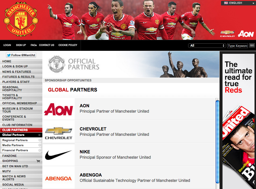 なおこの30社、ユナイテッドの公式HPで紹介されているものより3社多い。スポンサー契約はシーズン中であっても締結されることがあるため、『Metro』が紹介しているものが最新バージョンのようだ。クラブ公式HPでは他にメディアパートナーやファイナンシャルパートナーが掲載されており、日本企業からクラブオフィシャルTVである『MUTV』を放送するフジテレビジョンや新生銀行が名を連ねている。
