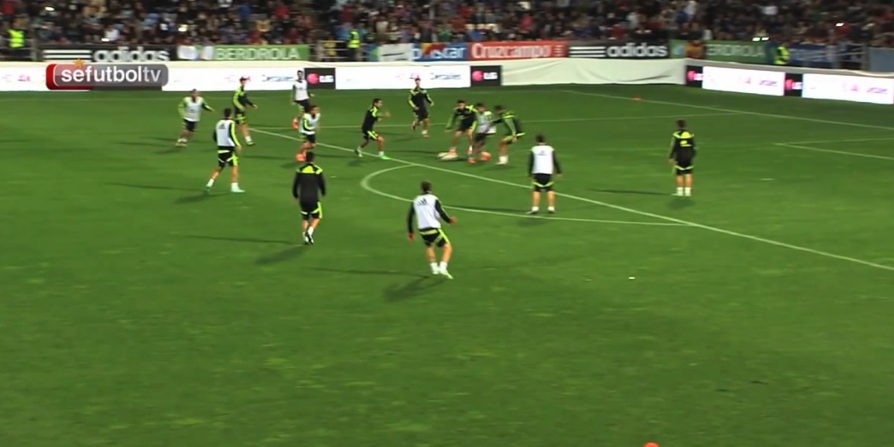 風間監督の言う「背中を取る」ための細かい駆け引きの部分だが、そのメニューや感想を書いていくとキリがないので、スペイン代表の練習で見られた1シーンをピックアップしたい。