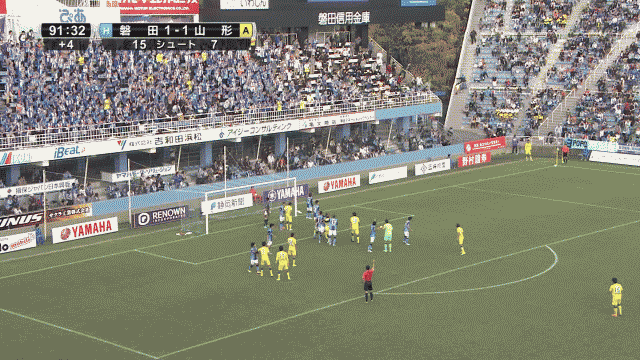 そして、磐田のホーム、ヤマハスタジアムで行われた決戦は、ディエゴのゴールで山形が先制するも、前半終了間際に山崎亮平が同点弾。後半も1-1で試合は進み、そのまま引き分けに終われば順位が上の磐田が決勝進出という状況で迎えた、92分、劇的な展開が待っていた。
