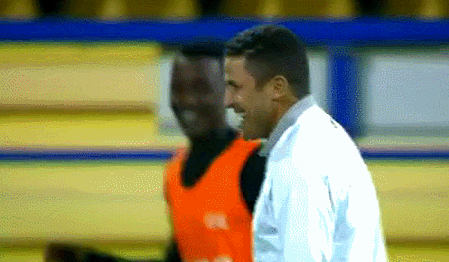 豪快にとびかかってきたカソラ・ムハンマドの肩がアンムータ監督の顔に激突! 何年に一回もないような劇的勝利の陰で、監督はこっそり痛みに耐えることになってしまった……