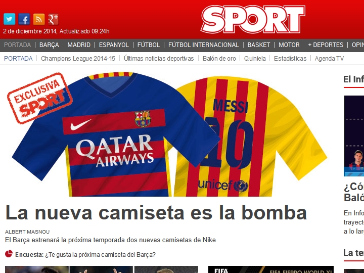 さて、バルサといえば毎年、地元カタルーニャのメディアによって行われる新ユニフォームリークが有名。関係者によると『Mundo Deportivo』と『Sport』が交互に伝えるのが“お約束"らしく、今年は『Sport』のターン。ということで2日、お待ちかねのリーク画像が登場した。