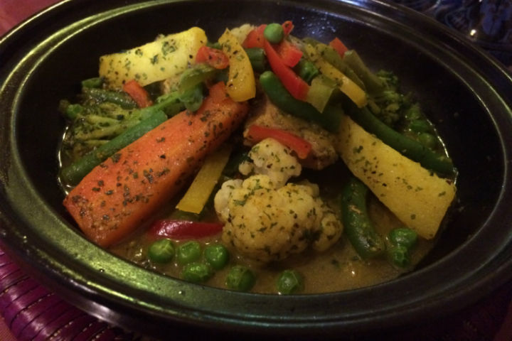 タジン。”帽子”は到着の際に店員が取り外してくれる。この日はチキンと野菜であったが、ケフタ(ミートボール)やラム肉の人気がある様だ。