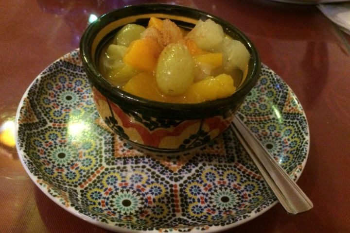最後に訪れたのはモロッコの代表的料理であるタジン鍋を名前に関したタジンやだ。伝統的なベルベル人の衣装に身を包んだモロッコ人シェフが伝統的なモロッコ料理を食べさせてくれる。こちらでは、メニューからタジン鍋を選択した。蒸し料理であるタジンは、近年の日本でもダイエット食として流行した。その時は、筆者もタジン鍋を購入して自作してみたのだが、そのまま蒸しただけでは味がなく飽きてしまい中年体型にすぐ戻ってしまった。だが、こちらのタジン鍋はスパイスが効いており、野菜中心のメニューであっても男性にもオススメできる味付けとなっていた。