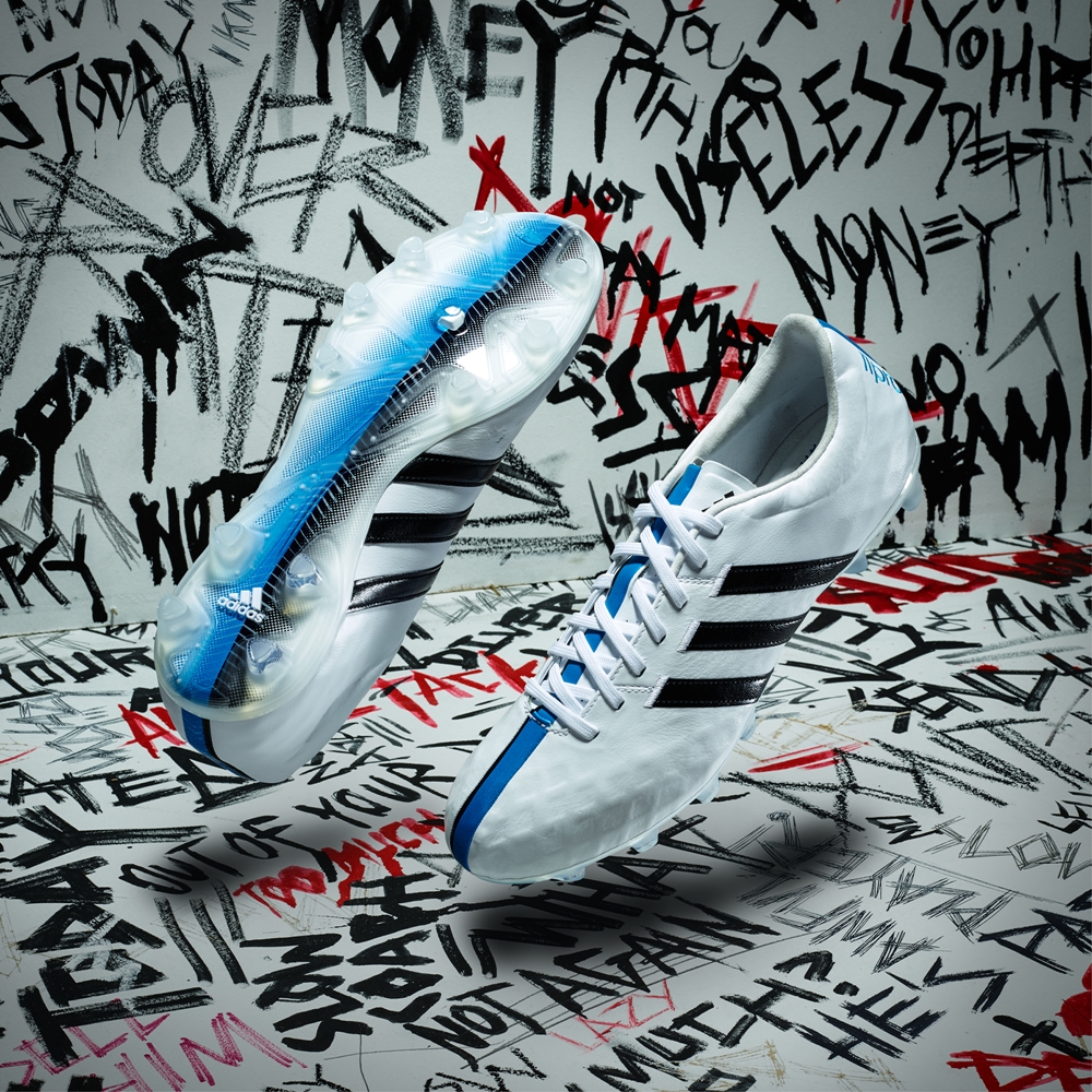 初代『パティーク 11プロ』をいまだ着用中(アウトソールはさらに前、『アディピュア4』と同じブレード型のスタッド)。中央のラインの有無等で見分けはつくが、色合いはそっくりだ。