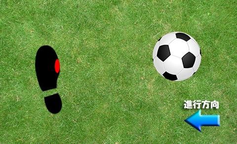 足裏でボールの上面をこすりながら転がしてボールにスピンをかけましょう。