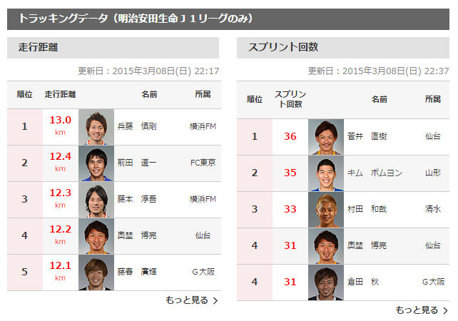 走行距離1位は横浜F・マリノスMF兵藤慎剛、スプリント1位はベガルタ仙台の右サイドバック(登録はMF)菅井直樹となった。