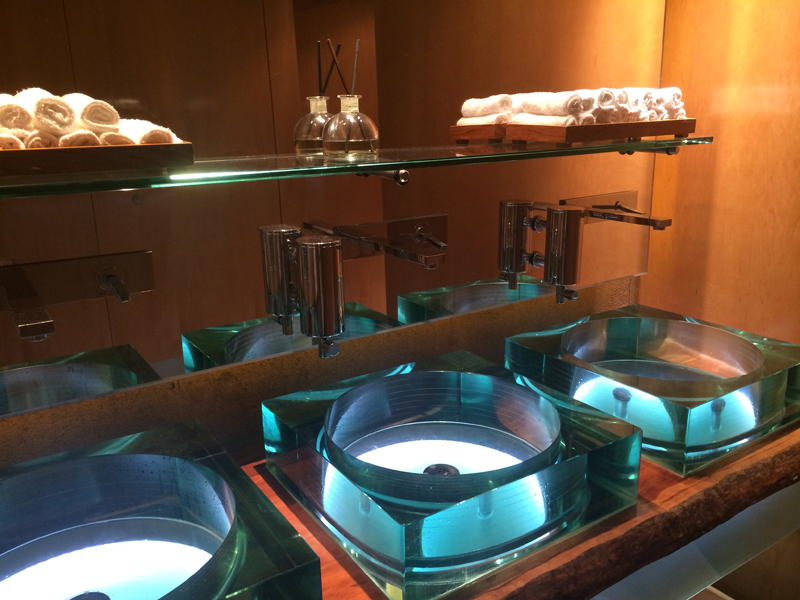 料理のみならず内装にも和洋融合の工夫は施されています。和風木材の間仕切りや間接照明があるかと思えば、カウンターバーやトイレには洋風の綺麗なブルー系ガラスが使われていて、違和感なくマッチしているのです。