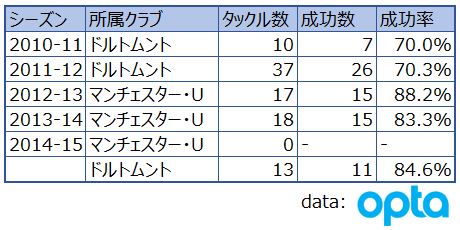 第一次ドルトムント時代にはタックル成功率は70%と低いものであったが、マンチェスター・ユナイテッド時代以降の成功率に飛躍的な上昇が見てとれる。