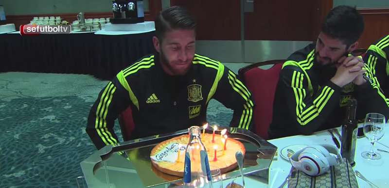 ホテルの一室に登場したのは、巨大なケーキ。ロウソクも立てられており、セルヒオ・ラモスに向けたメッセージも確認できる。