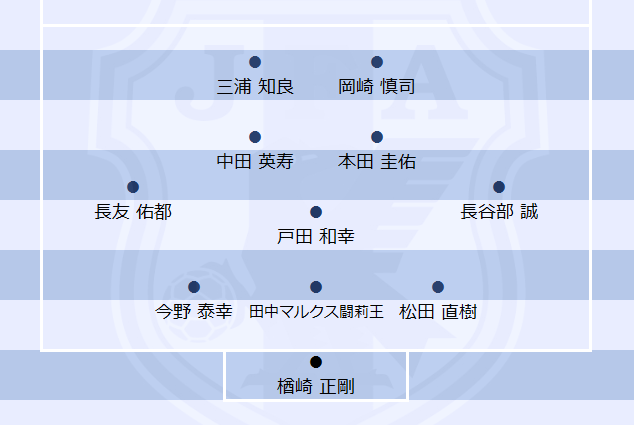 中田がゲームメイクし、左寄りのスペースをカズ、右を本田が使うようなイメージ。そこに両サイドの長友と長谷部が絡む。