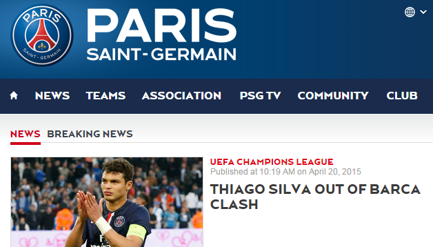 パリ・サンジェルマンは水曜日に行われるUEFA CLバルセロナ戦に向けた招集メンバーからキャプテンであるDFチアゴ・シウヴァが負傷により外れたことを発表した。