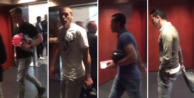 テア・シュテーゲン、マテュー、ペドロ、チャビの4人。Tシャツ、ポロシャツ勢のなかで、チャビはカーディガンにシャツでかっちり目。そして、みんな大体持ってるセカンドバッグ!
