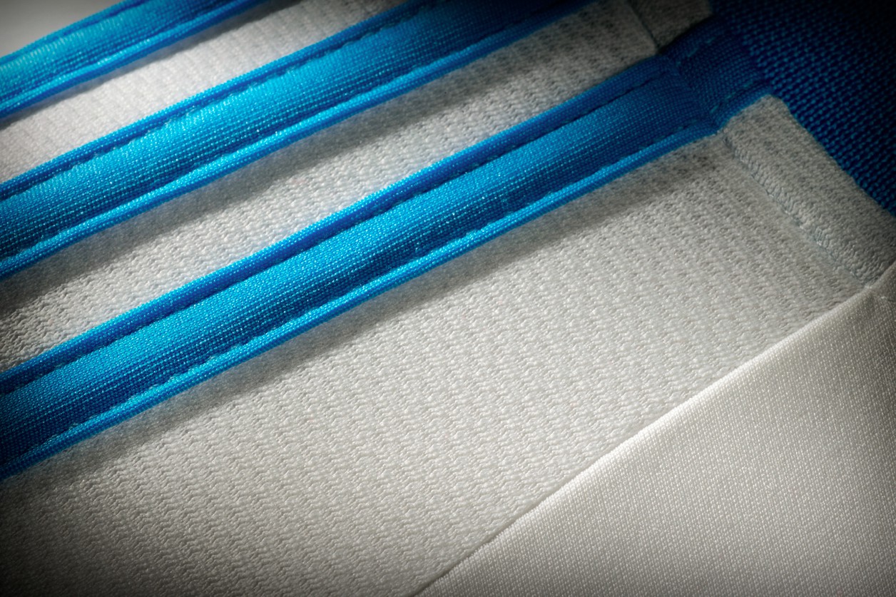 伝統的な白のホームは レアル・マドリーの2014-15モデルでお馴染みの立て襟を採用し、adidasの2015-16モデルらしくドット柄のストライプを袖と裾に配置。全体的にはシンプルで上品な仕上がりとなっている。