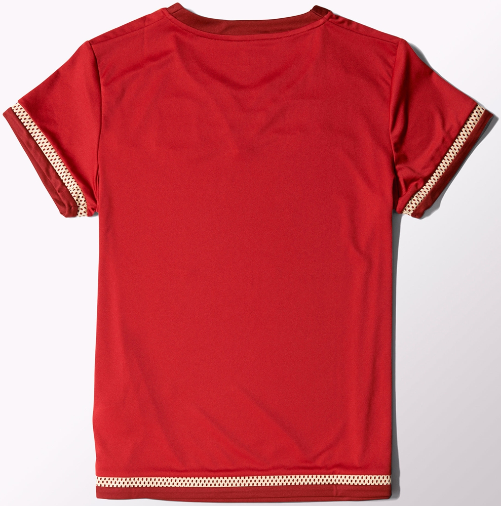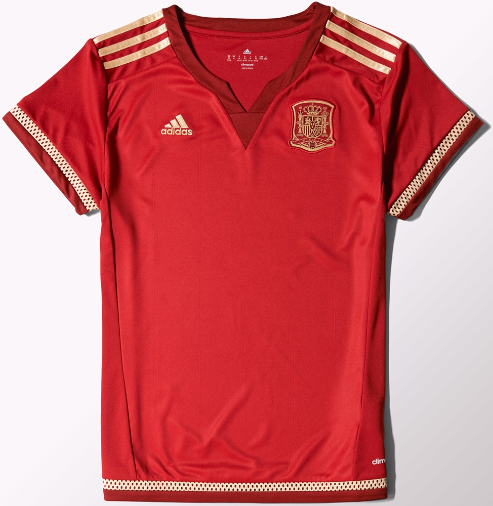 男子の現行モデル同様、深みのある赤にゴールドを組み合わせたスペイン女子代表の新しいホーム。袖や裾には最近発表が続いたadidas勢の有力クラブの新ユニフォームと同じようにドット柄のラインが入れられている。