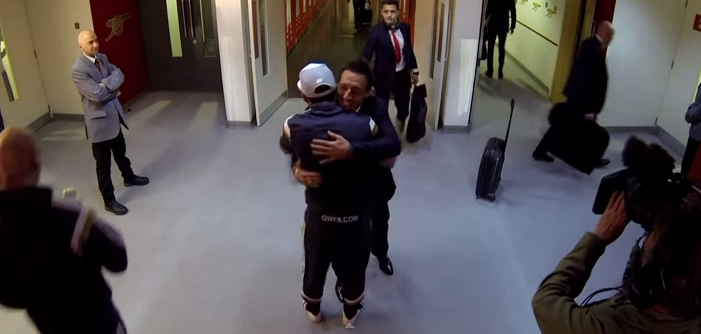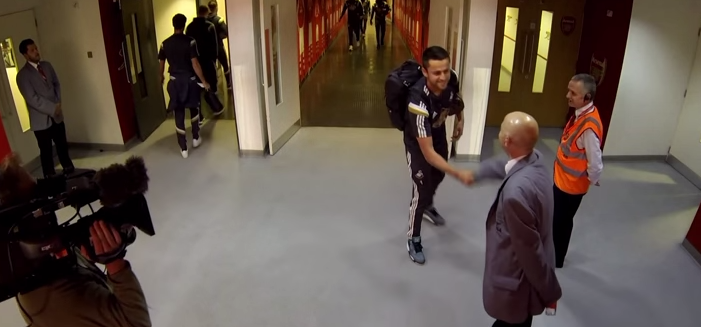 まずは動画冒頭(0:10~)。先にロッカールーム入りしたスウォンジーメンバーのなかで、ファビアニスキはアーセナルのスタッフ1人1人と握手!律儀です。