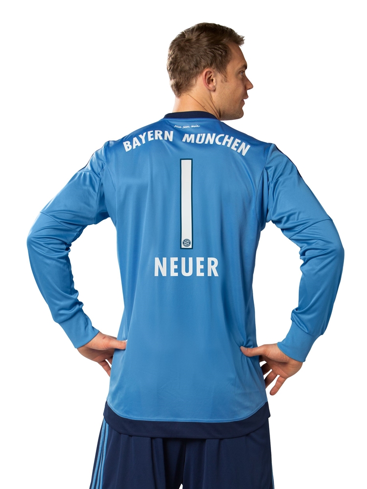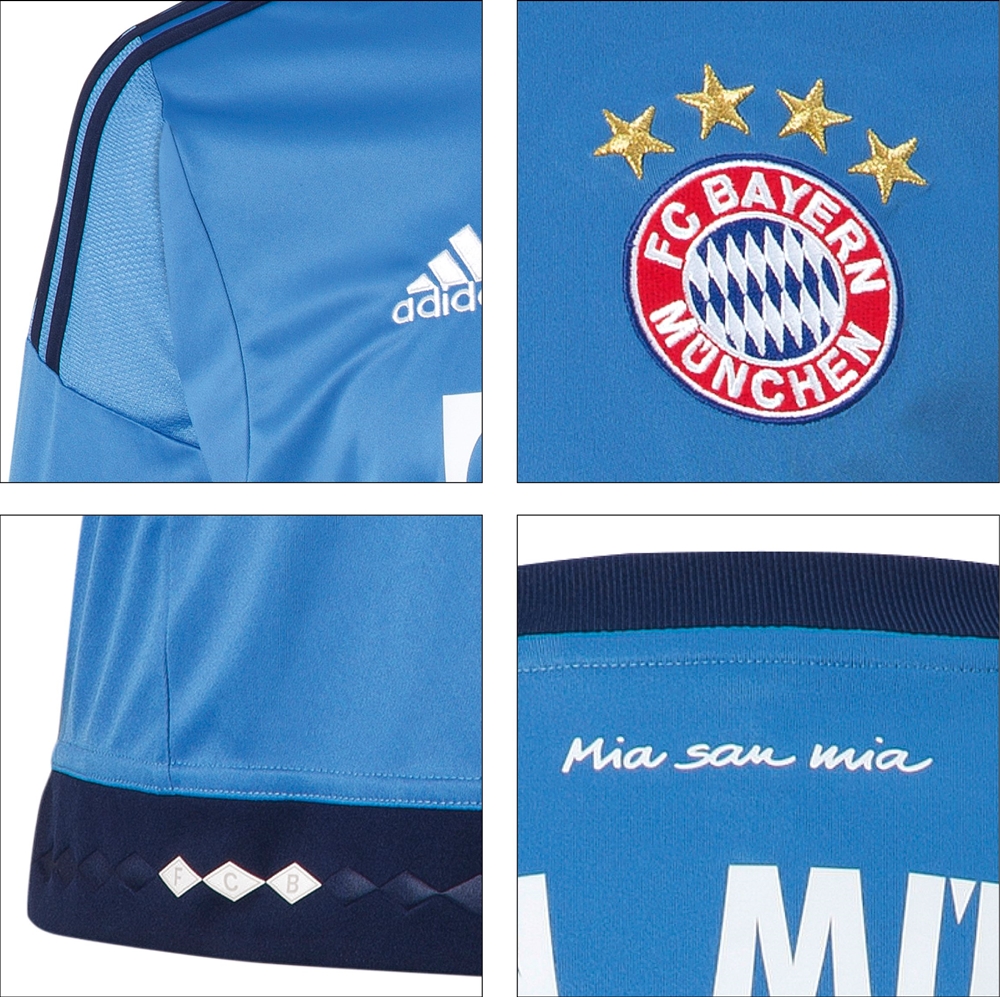 やや落ち着いたこの色は、ゼップ・マイヤーやオリヴァー・カーンらも着用してきたバイエルンの伝統的なGKユニフォームカラー。裾部分にはFP用の新ユニフォームと同じくバイエルン州の州旗に由来するダイヤのパターンが入れられている。