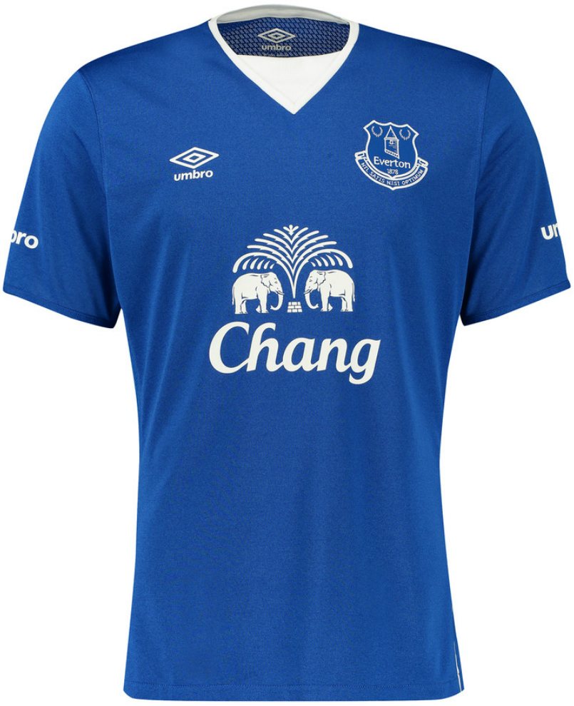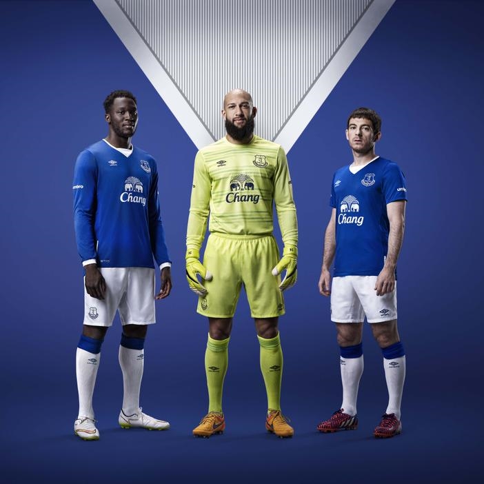 エヴァートンの2015-16ホームは、青を基調に伝統的な白のVネックを取り入れたクラシカルなデザイン。