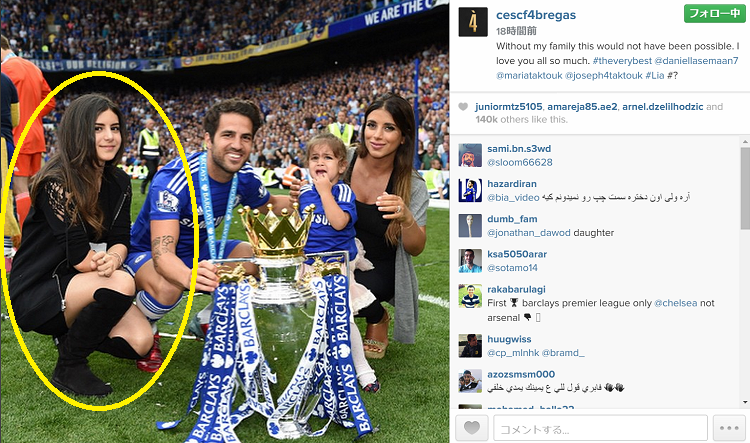 昨夏チェルシーに加入し、チームのリーグ制覇に大きく貢献を果たしたセスク・ファブレガスもピッチ上に家族を招き、優勝トロフィーとともに記念撮影をしていた。